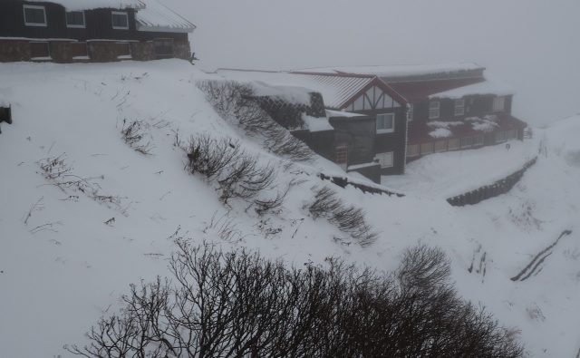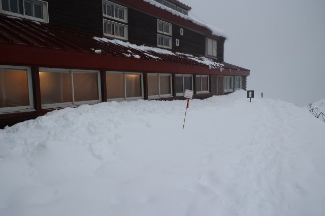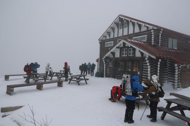 今朝起きると雪となっていました。気温は-2℃くらいでそれほど寒いわけではなく、やや湿った重たい雪でした。午後からは雨になる予報も出ていたためなのか、お客様は朝食を終えられると足早に下山されて行かれました。