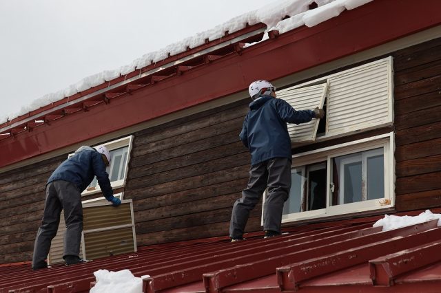 今シーズンの営業も残すところ後10日程となってきました。週明けは冬型の気圧配置となり、降雪が予想されるので、雪が積もってしまう前にと高い所も雨戸を入れました。これで小屋の中は暖かくなるかもしれません。