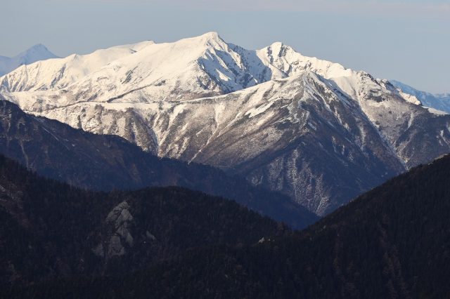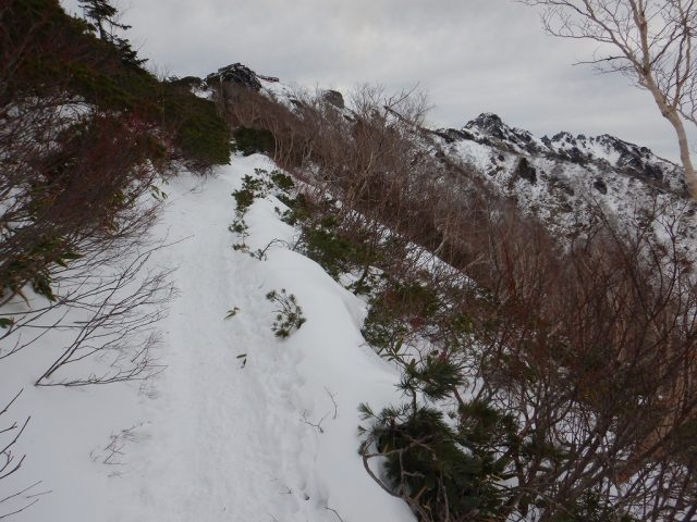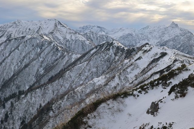 こうした曇り空の中、槍方面を望めば晴れた日以上に山肌の白さが際立って見えました。こうして見ると大天井方面はずいぶん白いことがわかります。