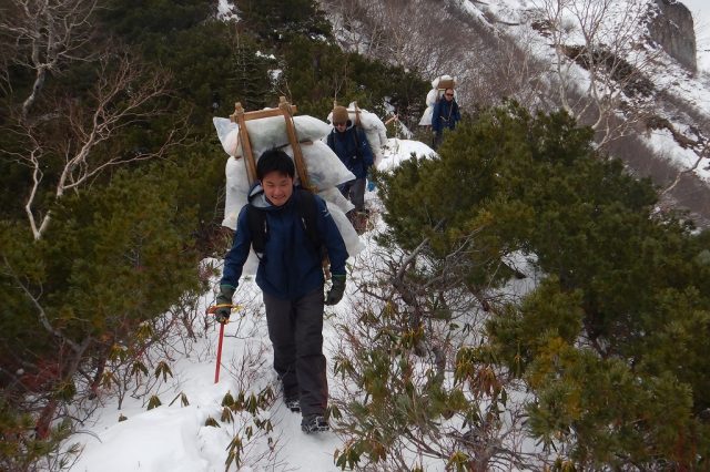 今シーズンのヘリコプターによる物資輸送はもう終わってしまったので、ゴミが溜まるとこうして合戦小屋まで運びます。荷物が重い時はやはりピッケルを持って行ったほうが安心出来ます。