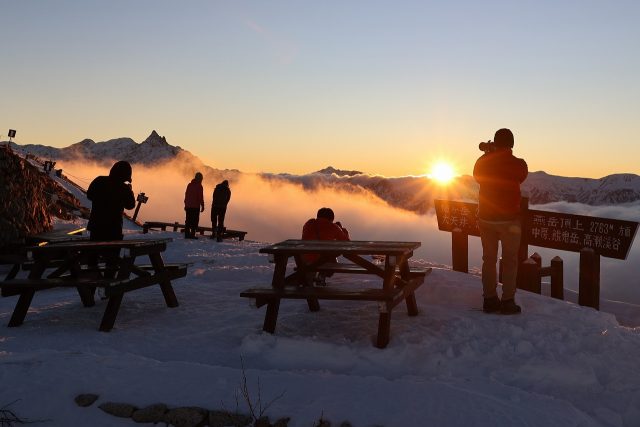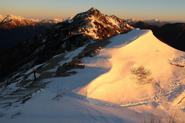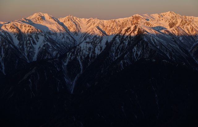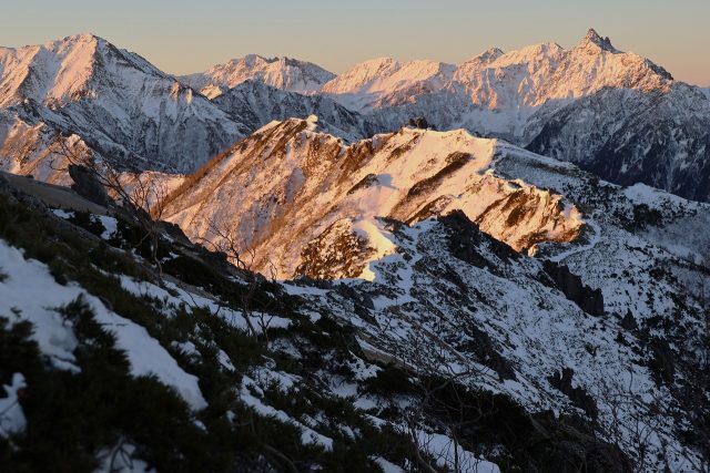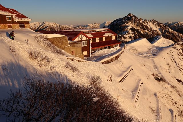 昨日は雲の多い一日でしたが、今朝になるときれいに晴れ渡っていました。そして太陽が昇ると白くなった山々は紅く染まり、美しい朝焼けとなりました。
