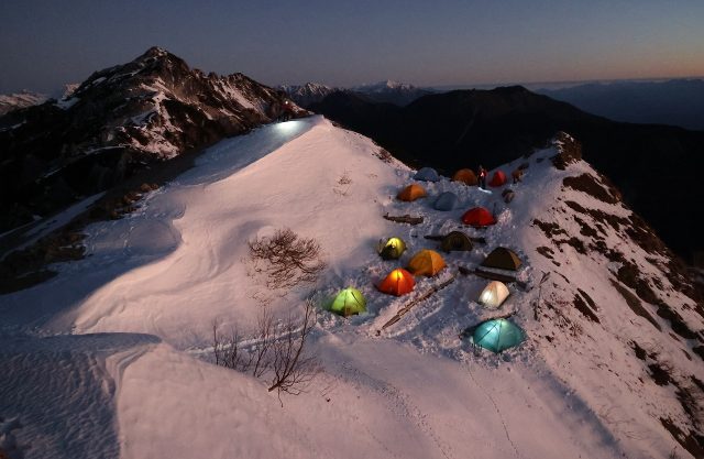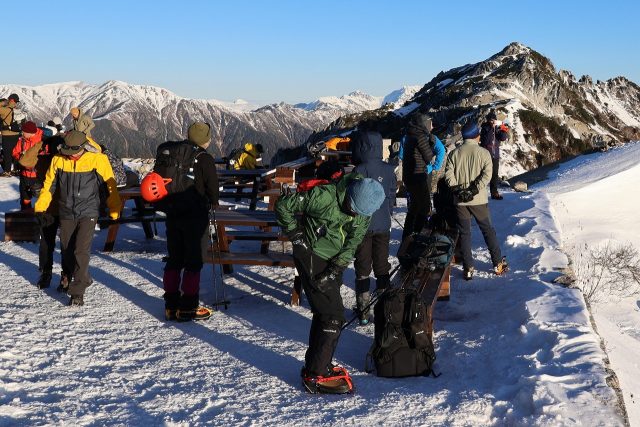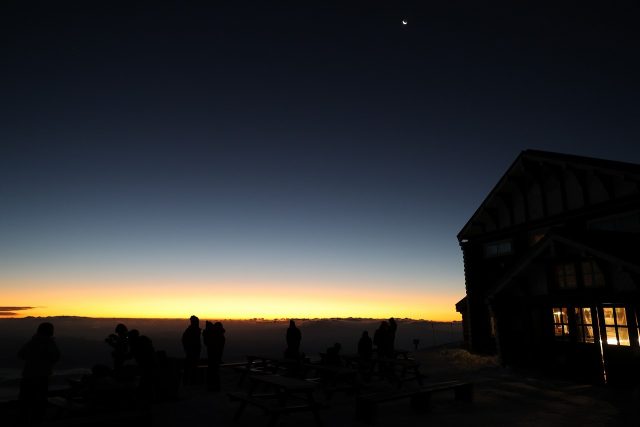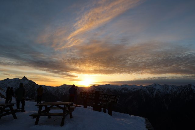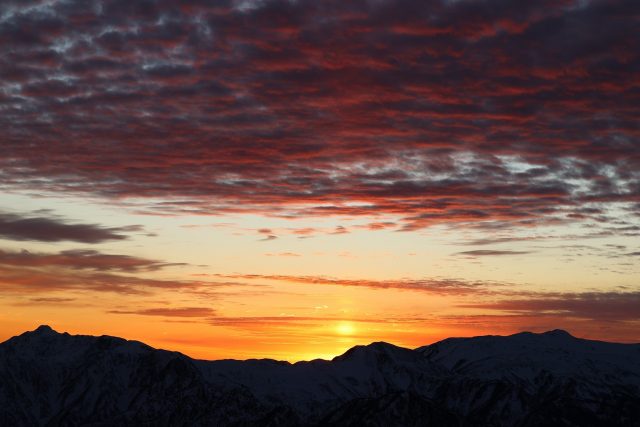 穏やかな一日となりました。夕方少し雲が多くなってきましたが美しい日の入りを見ることが出来ました。太陽は樅沢岳の左へと沈んでいきました。その太陽から伸びる太陽柱も見られました。明日の午後から再び雪となっていきそうです。晴れのタイミングが週末に合ってくれて良かったなと思いました。そして、次の週末はもう小屋締めの日となります。明日からは小屋締め作業も本格的に始めていきます。