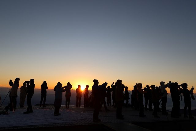 日曜の朝らしく、ヘリポートは大変な賑わいとなりました。ヘリポートは日の出と朝に染まる槍ヶ岳を同時に楽しむことが出来る素敵な場所です。