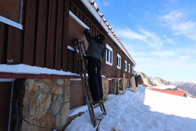 今週前半は冬型の気圧配置となり、かなり強い寒気が入ってきそうな予報となっています。もう、残り1週間となってきたので雨戸入れも進めました。館内は暗くなってしまいましたがその分暖かくなりました。この雨戸もやがて雪の中に埋もれてしまうことでしょう。この第1別館の雨戸が外せるのは来年の6月頃となります。そうなると雨戸が付いている期間のほうが長いことが分かります。改めて山の夏というのは短いものだなと考えさせられました。
