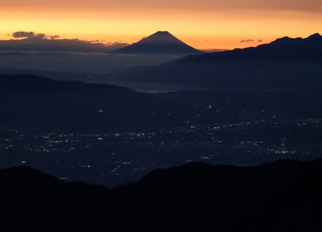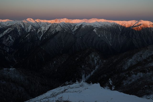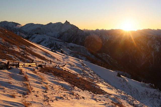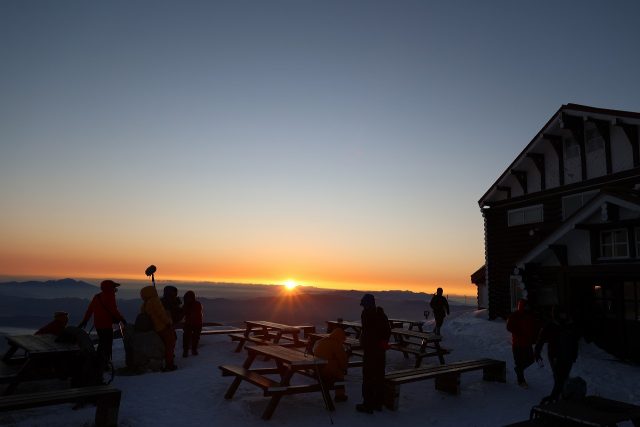 太陽が昇りだすと当たり前なのですが、標高の高い所から光があたり始め、そのラインが少しづつ下がってきます。そんな変化を眺められるのも山の上ならではないでしょうか。