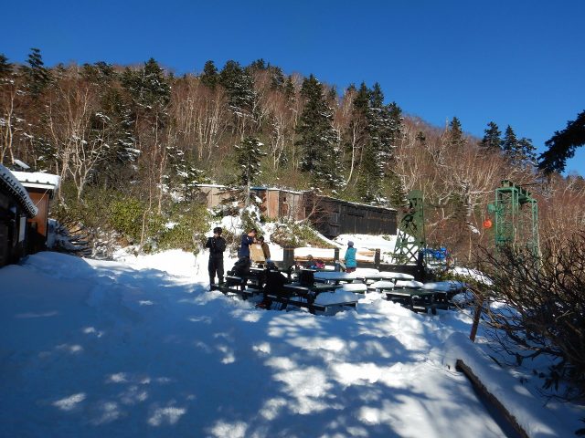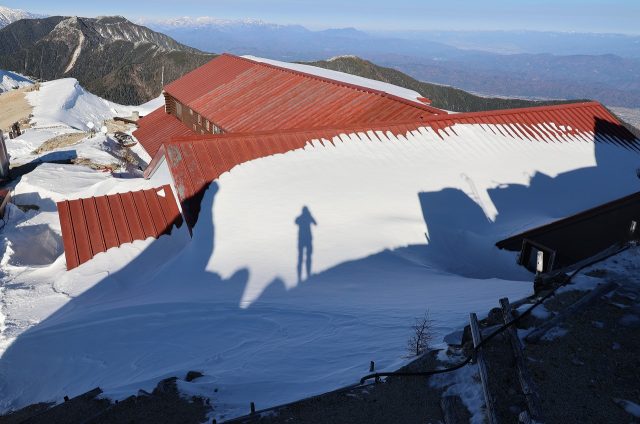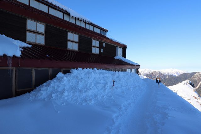 燕山荘周りの雪も少しづつですが増えてきています。雪に埋もれてしまった方が小屋内が暖かくなるというメリットもあります。