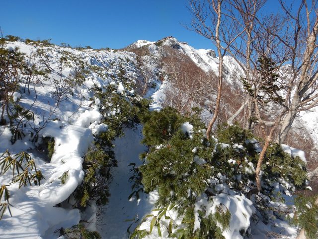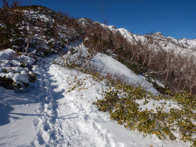 先日の降雪による登山道上の大きな変化はあまりなく、少し積雪が増えたといった感じです。チェーンスパイクでも歩けなくはないですが、やはり10本歯以上のアイゼンがあった方が安心かと思います。特に下りの際はピッケルがあったほうが安心感が増します。今週末は多くのお客様がいらっしゃると思いますが、そうなると雪面はツルツルになってしまい、アイゼンがあったほうがいい状況に変ってくるかもしれません。