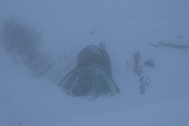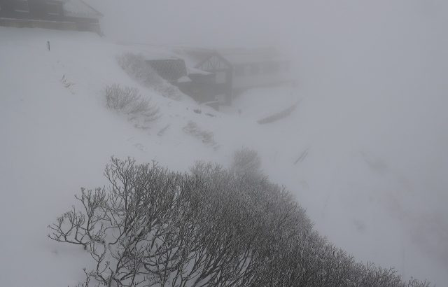 こんな天気の中、テントで頑張っていらっしゃる学生さんたちもいらっしゃいました。今はまだテント場はそれほど積雪量は多くなく、くぼ地状の所に張れるので、まともな季節風(西風)をうけなくてすんでいますが、これから先、積雪量が増えればこのくぼ地は埋まってしまい、稜線上と同じような状況になり、季節風をまともに受ける場所に変ります。冬期営業中頃は非常に厳しい環境となります。森林限界より下の合戦小屋辺りにテントを張って、燕岳の往復をするほうがいい場合もあります。