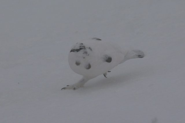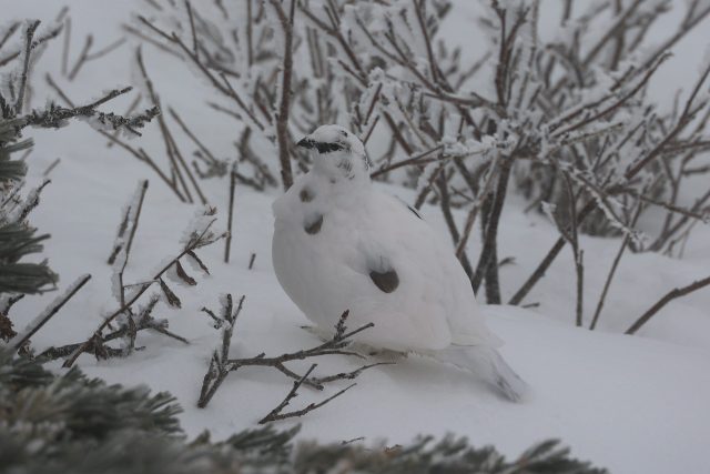 風雪の中、ライチョウ君は元気な姿を見せてくれました。ライチョウたちにとって今日の天気はなんてことはないのでしょう。エサとする木の芽をつついていました。今はまだ小屋周りで姿を見ることが出来るのですが、厳冬期になると生息域の標高は少し下がります。