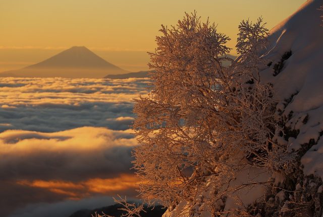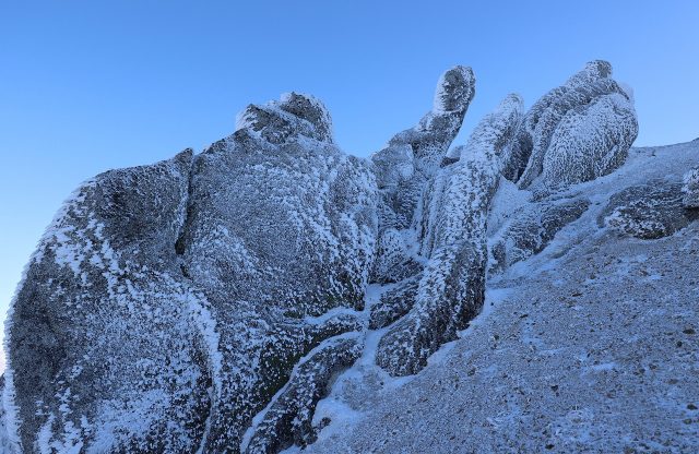 6時25分過ぎ、太陽が昇ってくるとびっしりと付いた霧氷までもがピンク色に染まり出しました。本当に美しい光景でした。昨日の悪天の後だからこそ見られた光景です。