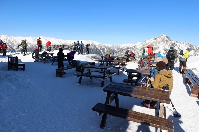そろそろ日の出時刻だと思い外へ出ると皆様の視線は日の出とは違った方向でした。そちらに目をやるとちょっと遠かったですが、3羽のライチョウがラッセルしながら歩いている姿を見ることが出来ました。秋頃はライチョウの姿をほとんど見なかったのですがここ数日はよく見かけるようになってきます。この周辺で生まれたライチョウたちなのでしょうか。そうだったらうれしいな。