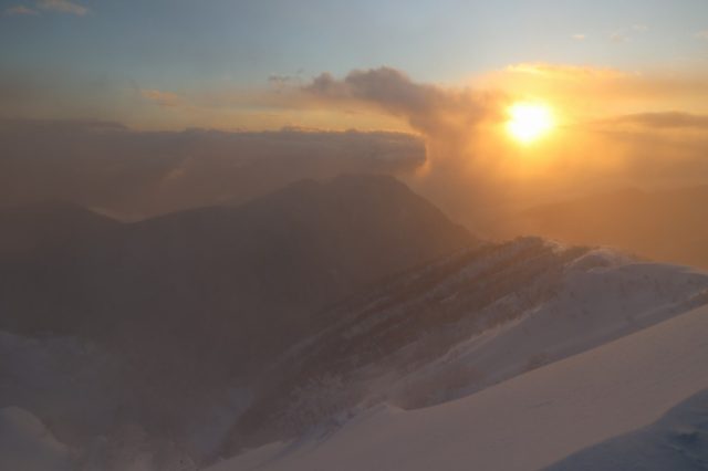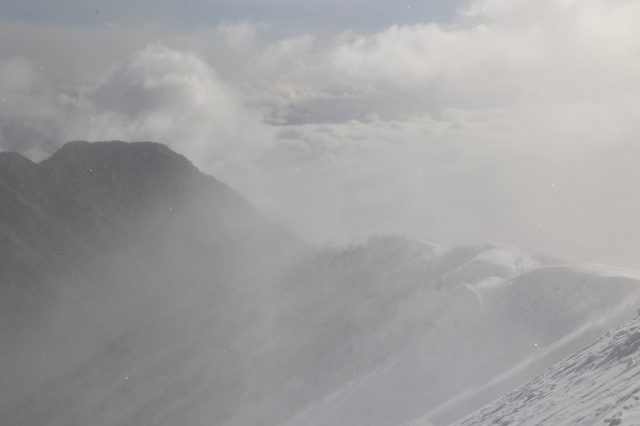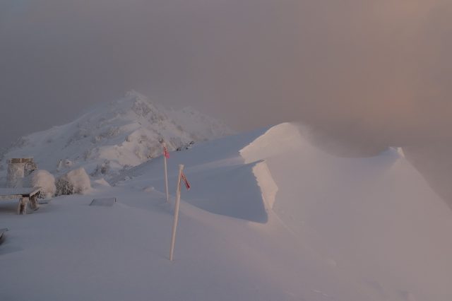 昨日は到着するのがやっとという状況の中で登って来られたお客様に、今朝は少しのご褒美がありました。外が明るくなり、燕岳、ぼんやりとした日の出を見ることが出来ました。ただ、それもほんのわずかな時間で準備して外へ出た時には真っ白になり、どんどん風と雪が強まってきました。