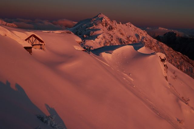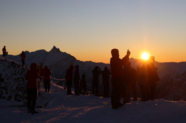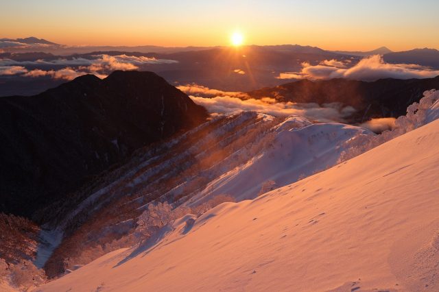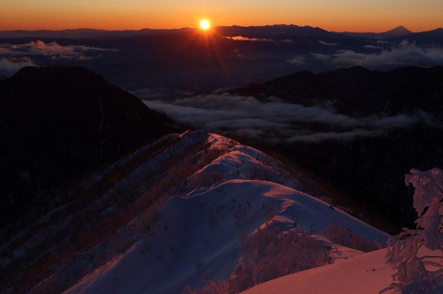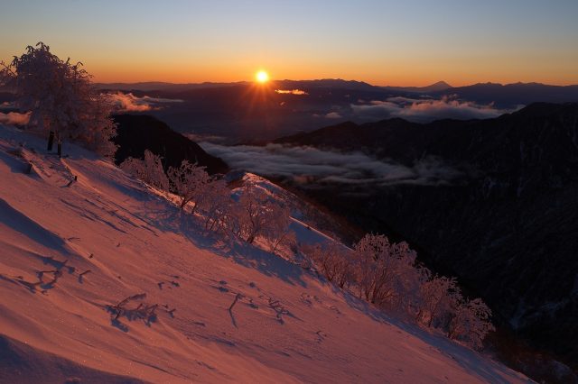 今朝の玄関先の温度計は-15℃まで冷え込み、冬らしい寒さとなりましたが高気圧に覆われ、晴れとなり美しい御来光が見られました。先日、雪が降ったばっかりなので木々や岩には氷がびっしりと付き、辺り一面真っ白でいつも以上に美しい朝焼けとなりました。