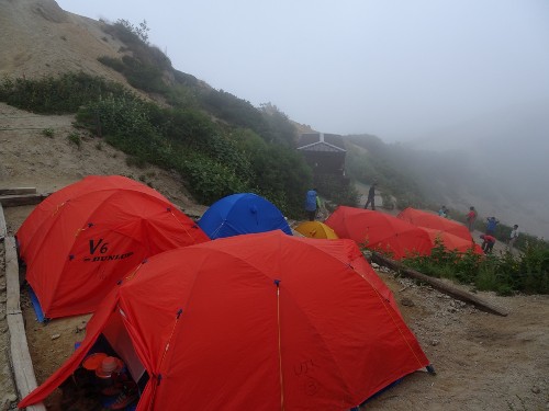 普段は個人用テントで賑わう燕山荘のテント場ですが、このところ学生さんの大きなテントが多くなってきました。僕も学生の頃はあのような大きなテントで、仲間と寝食をともにしたものです。少し懐かしい気分になります。