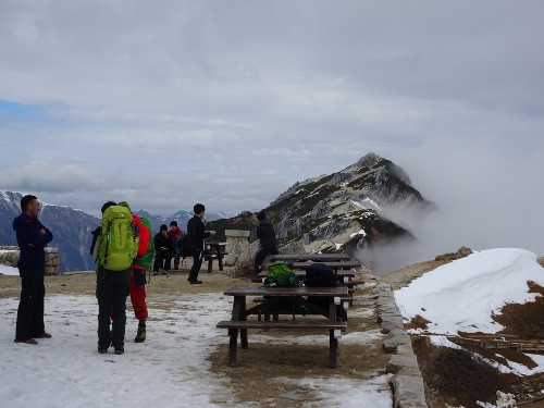 槍・穂高の稜線には、雲がかかり出し、天気は下り坂へと向かっていくことを物語っていました。それでもこの光景もなかなか美しいものでした。