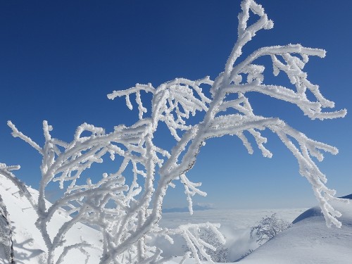 昨日の雪は湿った雪だったので、岩や木々にはびっしりと霧氷が付き、美しい光景を見せてくれました。今年は霧氷が見られる日が多いようです。