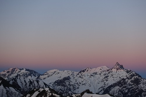 二日ぶりに晴れました。日の出前、気温は氷点下まで下がり、凛とした空気に包まれて、槍ヶ岳の上の西の空は、ほんのりピンク色になり、それが刻々と変わっていき、とても素敵な朝を迎えました。