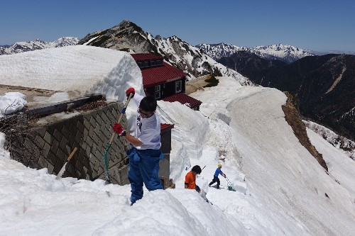 今年は雪が少ないので、水源地の雪も少ないだろうと早くも水源地の下見に行ってきました。すると驚いたことに水が湧きだしている辺りの雪渓が割れていました。例年であれば雪を3~4mほど掘り下げて、水源地に辿り着くのですがこんなことは初めてです。実際、ポンプアップ出来るようになるにはもう少し時間がかかりますが、おいしい湧水を皆さまにもご利用いただけるようになると思います。