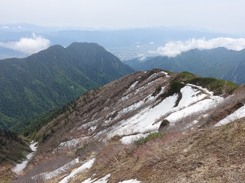 日が高くなるにつれて、雲海が消えていき、やがてきれいな空が広がってきました。それにしても今日で5月が終わるというのに合戦尾根のこの雪の少なさはどういったことでしょう。雪解けが早いと花の咲きだしも早くなってきます。