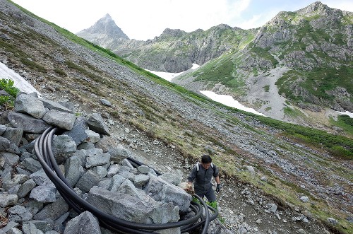 例年ならまだまだ厚い雪の下のはずですが、雪渓が割れて水源が見えていました。今シーズンお世話になる命の水、その岩の間から流れ出る量は多く、頼もしい限りです。