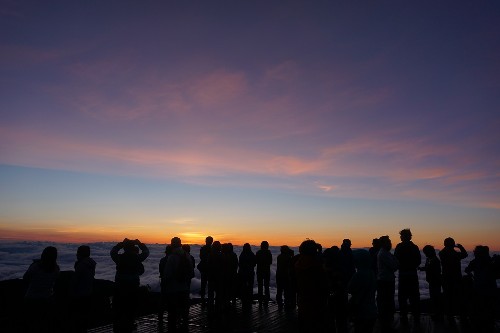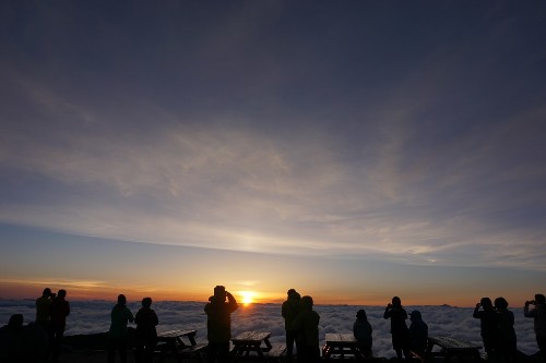昨夜の雨は上がり、きれいな雲海が広がる朝を迎えました。気温は6度と寒く、皆さん、寒さに震えながら日の出を待っていました。ただ、あまりにも美しい景色のためか、小屋に戻られる方もほとんどいらっしゃらなく、日の出の瞬間を待っていらっしゃいました。