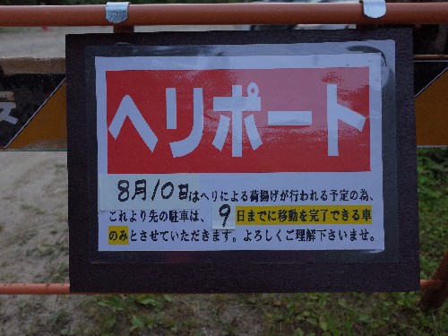この危険を回避するために、駐車場のちょうど中ほどに、ヘリ予定日の数日前から上記のような看板を設置しております。ちなみに今度のヘリは、明日10日(水)でございます。