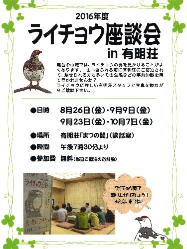 さて、8月26日(金)は有明荘のイベント『第2回ライチョウ座談会』が開催されます。雷鳥は長野県の県鳥に指定されており登山の途中で姿を見かけることもあります。雷鳥について詳しいスタッフが写真を見ながらお話をしたり皆様の疑問に答えたりとアットホームな会です。