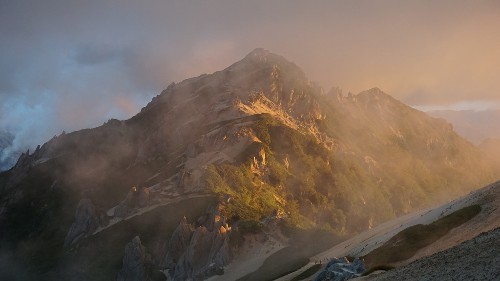 台風の吹き返しの強い西風は、とても冷たく、いつもの服装では少々つらいものがありましたが、この風で塵が吹き飛ばされ、空気が澄んで槍ヶ岳をはじめ、周りの山々は非常にくっきりと見えていました。