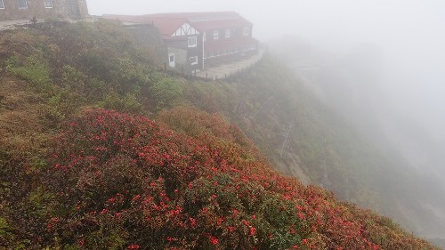 ウラシマツツジもすっかり秋の色となっています。こちらも雨とガスでモノクロの世界になっている景色の中、花を咲かせたかのように鮮やかでした。