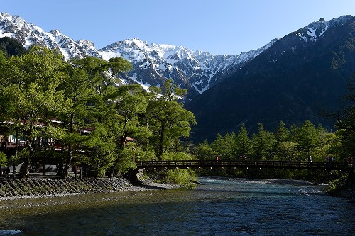 河童橋の近くから定番の写真ですが、前日の降雪で稜線が真っ白に輝き、新緑とのコントラストがきれいでした。