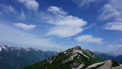 このところ10時を過ぎるとガスに包まれてしまう天気が続いていたのですが今日はガスの沸き上がりもなく、きれいな青空を望めました。そしてそこにある雲がなかなかいい感じでとても素敵な空が広がっていました。その分、日中の気温も上がり20℃まではいかなかったのですが、体感的に今シーズン一番の暑さとなりました。ちなみに麓も松本でも30℃を超え、かなり暑かったようです。気温だけを見ればもうすっかり夏ですね。