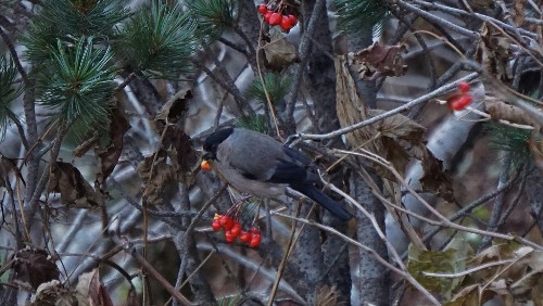 ヘリポート下にあるナナカマドはすっかり葉っぱがなくなってしまいましたが、その赤い実がとてもきれいです。その赤い実にはウソのメスがやってきて、実を食べていました。よく見るとそのすぐそばには幼鳥がいて、親からエサをもらっている姿を見ることが出来ました。この実を求めてやってくる鳥は他にもライチョウなどがいます。エサが少なるこの季節、貴重なエサとなるようです。