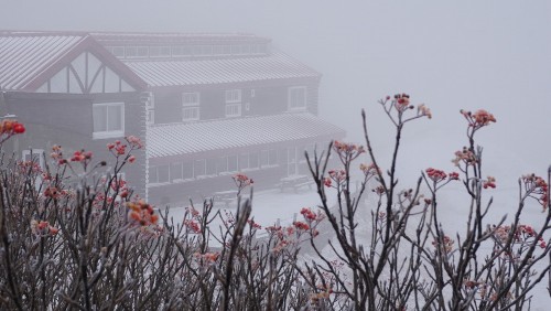 昨夜は、前回の台風の時のように小屋が揺れる程の風が吹くことはありませんでしたが、朝になっても強い風は残っていました。そして気温がぐっと下がって氷点下になっていました。外は雨ではなく、いつの間にか雪へと変わっていました。そしてあちこちに霧氷も出来ていました。
