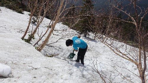 合戦小屋の少し上では雪解けが進み、植物の上を歩くようになってきたのでルートを少し変えました。これからはこんな作業が増えていきます。高山植物を守るためにもかかせません。
