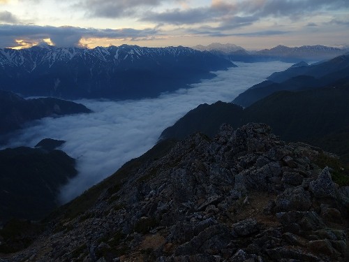 ▲夕暮れの高瀬 遠望 剣・立山連峰と針ノ木岳