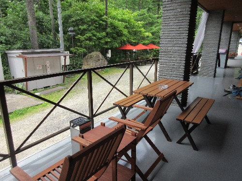 ザック置き場の奥に設置された休憩場所、爽やかの風を感じながらゆっくりお過ごしいただける空間です。(唯一の喫煙場所)