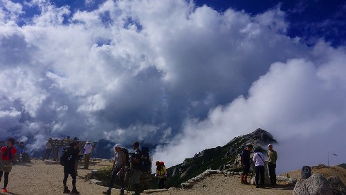夕方になるとようやく槍ヶ岳も姿を見せてくれました。すっきりとした空は見られませんでしたがもくもくとした雲があちこちに見られ、雲の変化を見るには楽しい一日でした。