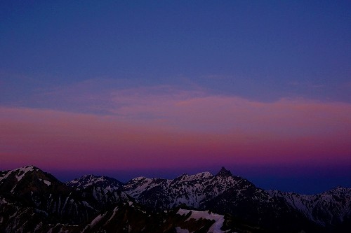 そんな日の出の前、日の出と反対方向ににある槍ヶ岳の上空が美しいピンク色に染まりました。