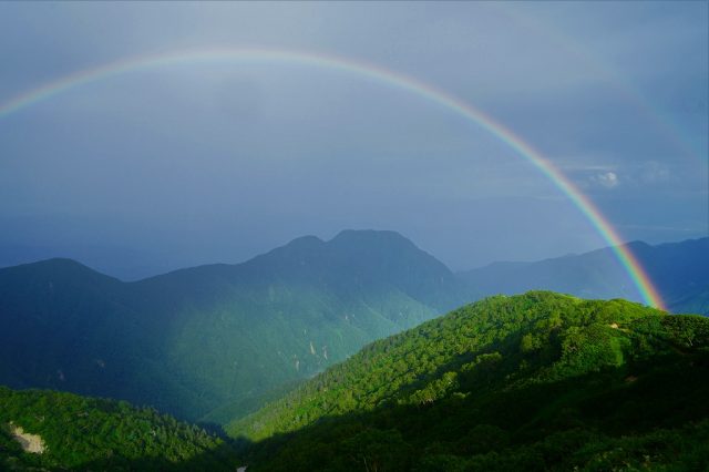 そのガスがやがて濃くなっていき、あたり一面がガスで真っ白になってしまいました。そして、今日のこの強い日射により、雷雲が発達して、お昼過ぎより激しい雷雨となりました。早く着かれた方はこの雷雨に合わずに到着されたのですが、そのあとの到着になった方はびしょぬれでの到着となりました。また、稜線を歩かれていた方は、かなり怖い思いをしたのではないでしょうか。夏山は早出早着と言われますがその言葉通りの位置にちとなりました。その雷雨がやんだ後、美しい虹が現れました。
