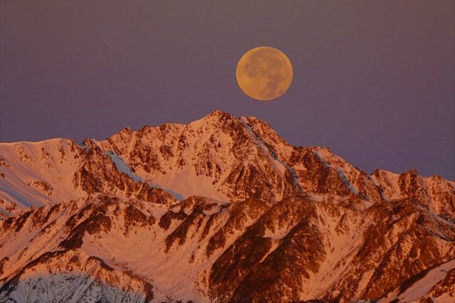 今日の場合はご来光より、気になるものがありました。月の入りです。太陽が昇って、雪面がほんのりと紅く染まるころ、まんまるな月は水晶岳のほぼ真上へと沈んでいきました。