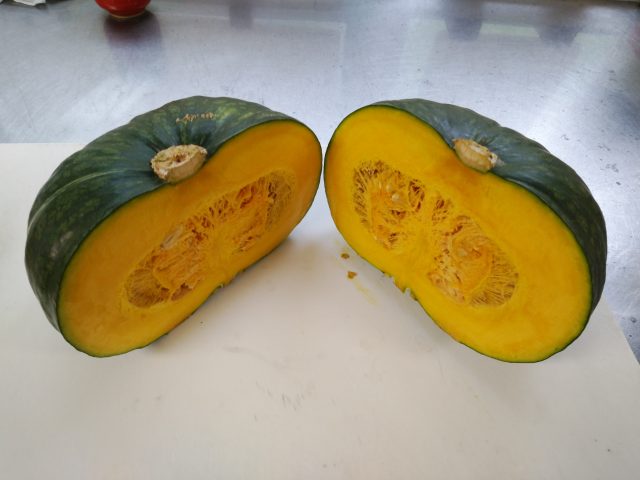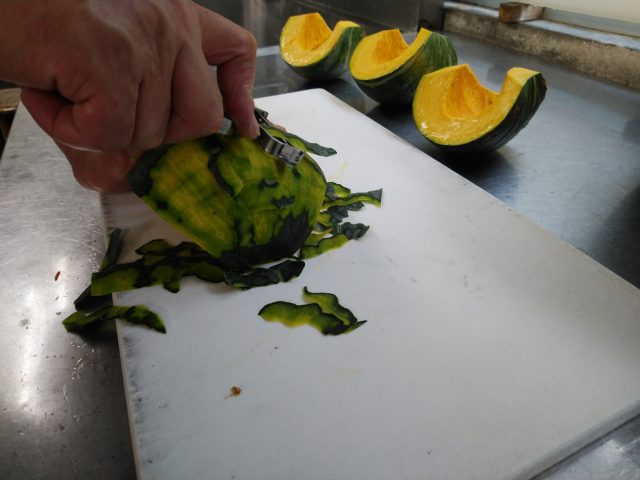 外皮を薄く抜くと、カボチャって緑色なんですよ。