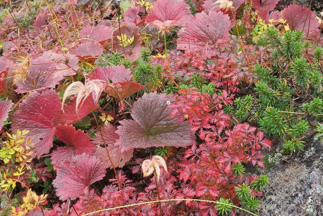 晴れて槍の山頂が見える時間帯もありました。クロマメノキが一面紅葉してます。