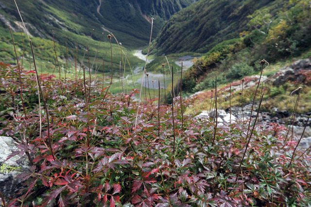 赤くなったチングルマ越しに槍沢を望む。