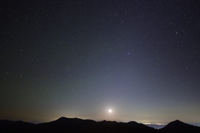 大天井岳と常念岳の間に輝くのは、有明の月。