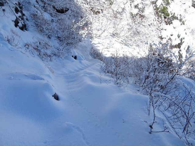 積雪平均30cm前後。この辺りは風が強かったものと思われ、吹き溜まり箇所はほとんどありません。ただ、今後新雪直後は夏道ルートが不明瞭になりやすい事、またトラバースを強いられるため、凍結した時にこの斜面にて滑落した場合は止まりにくい点、それぞれ注意が必要です。