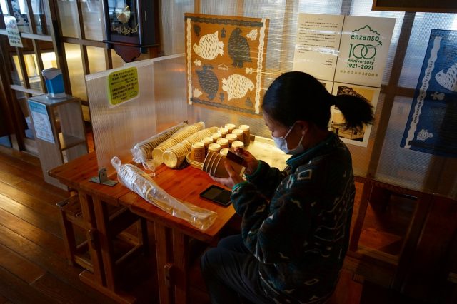 今日のような天気の日は外作業は諦め、小屋の中での作業を進めます。水を節約するためにコーヒーか紙カップで販売していますが、その紙カップにはこうしてひとつづつスタンプを押して、皆様に喜んでいただこうとしています。