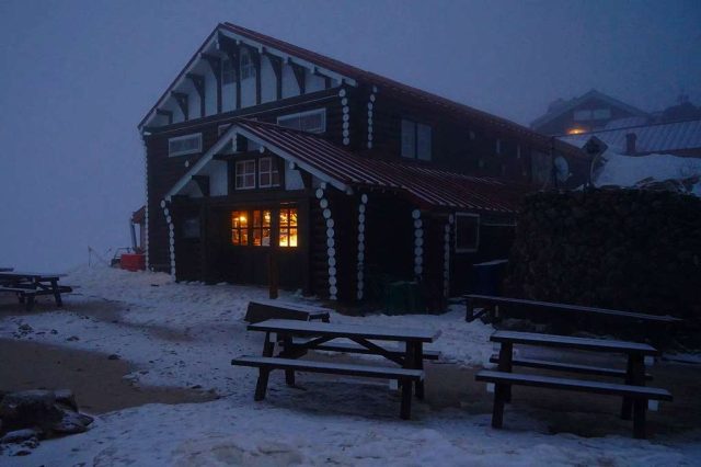 雲海はどんどんと高くなってきて、お昼頃には雨が降り出してきました。皆さん、天気予報をよくご存じのようで雨が降り出す頃までにはほとんどのお客様が到着されました。その後、雨はだんだんと風と共に強くなり、厳しい天候となってきました。そして、寒気が入ってきたのか気温がどんどんと下がっていき、17時頃には氷点下となり、雨が雪へと変わっていきました。後半到着された方は、かなり寒そうで受付用紙を書けない方もいらっしゃいました。やはり登山において濡れることと風に吹かれることはかなりのリスクを負うことになります。一歩、間違えば低体温症へとつながります。