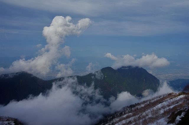 日差しが弱いため、雪は固く、昨日ほど除雪作業ははかどらなかったような感じです。ただ、昨日と違って今日は安曇野側の展望も広がり、美しい景色を見ながらの作業となりました。有明山の左上に沸き上がる雲は龍のような面白い形をしていました。