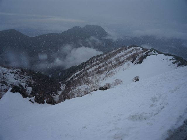 朝になっても天気は回復していなくてガスに包まれて真っ白でしたが、やがてガスが切れて展望が開けてきて、間もなく大粒の雪が降り始めました。これが雨だったら残念なのですが、雪だったのでなんだかうれしくなりました。