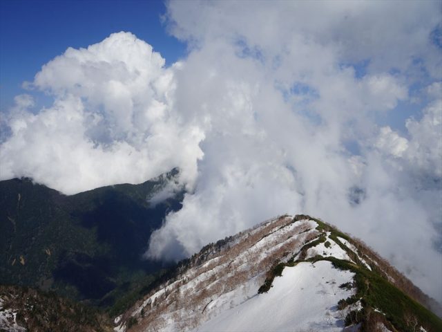 午後になってようやく青空が広がってきて、太陽の光が差し込みました。5月の太陽はやはり強烈ですね。じりじりと日に焼けていくのを感じました。また、この強い日差しによって、上昇気流ができたのか安曇野側には積雲が沸き上がっていました。